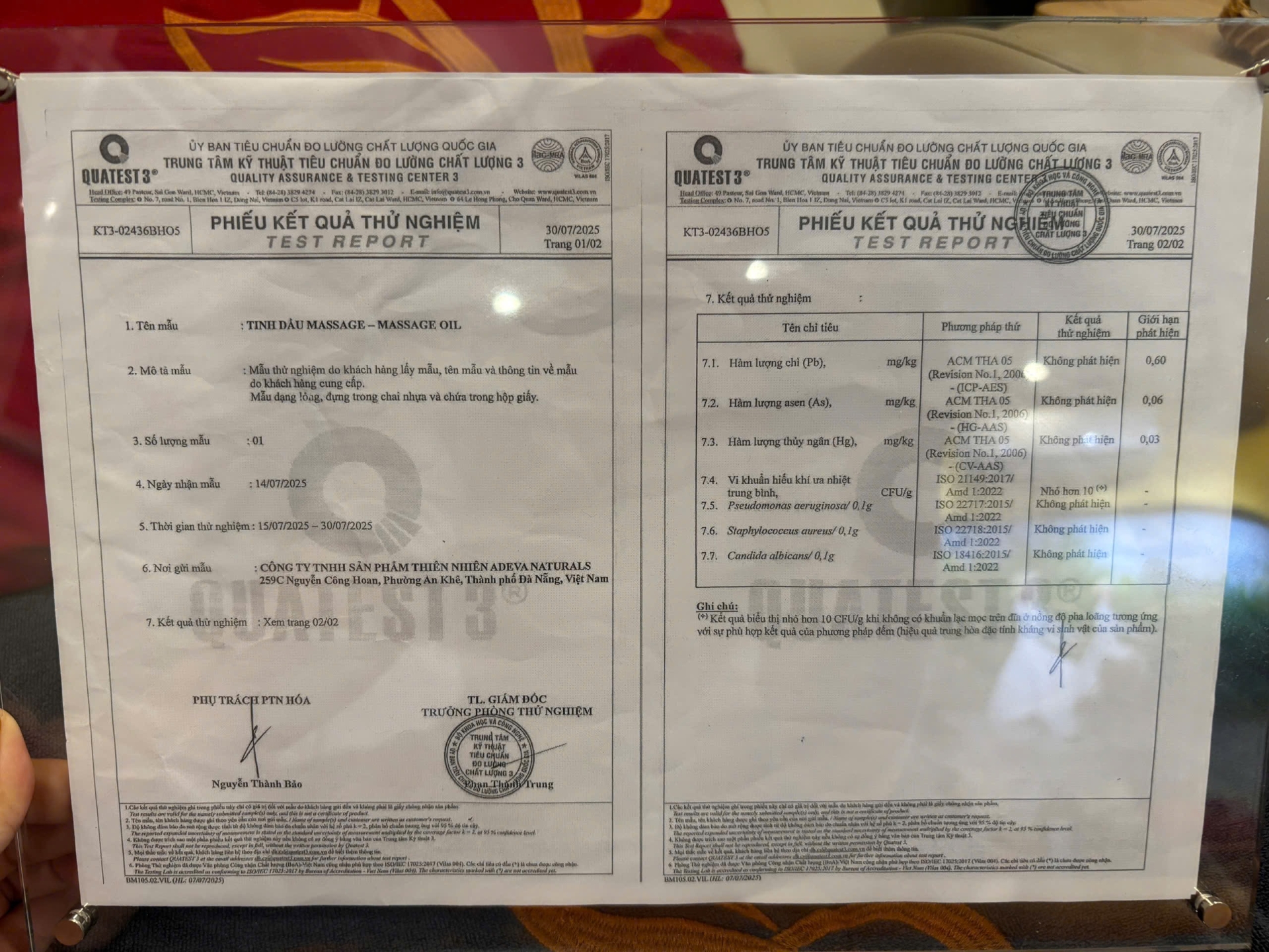 저희 스파에서 사용하는 마사지 오일은 베트남 국가 공인 시험기관 QUATEST 3의 시험을 통해 안전성과 품질을 공식적으로 인증받은 제품입니다.