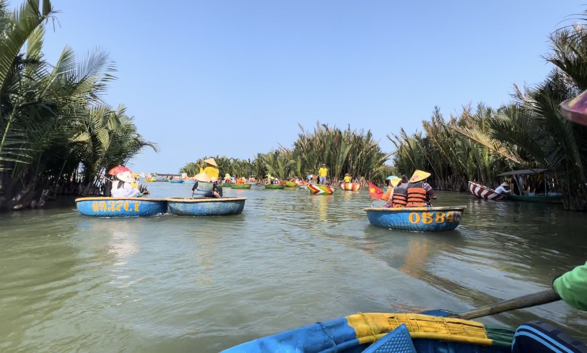 Local boatmen paddle traditional round bamboo boats through the coconut forest and often perform fun spinning tricks that tourists love