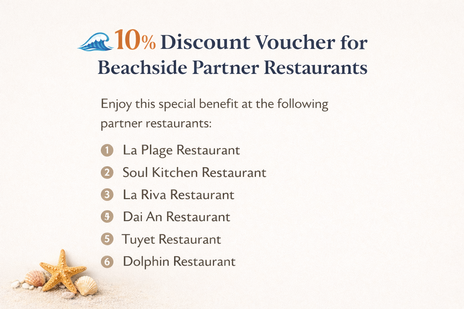 Choose your favorite restaurant and enjoy a delicious meal while relaxing at the beautiful An Bang Beach, with a 10% discount benefit.